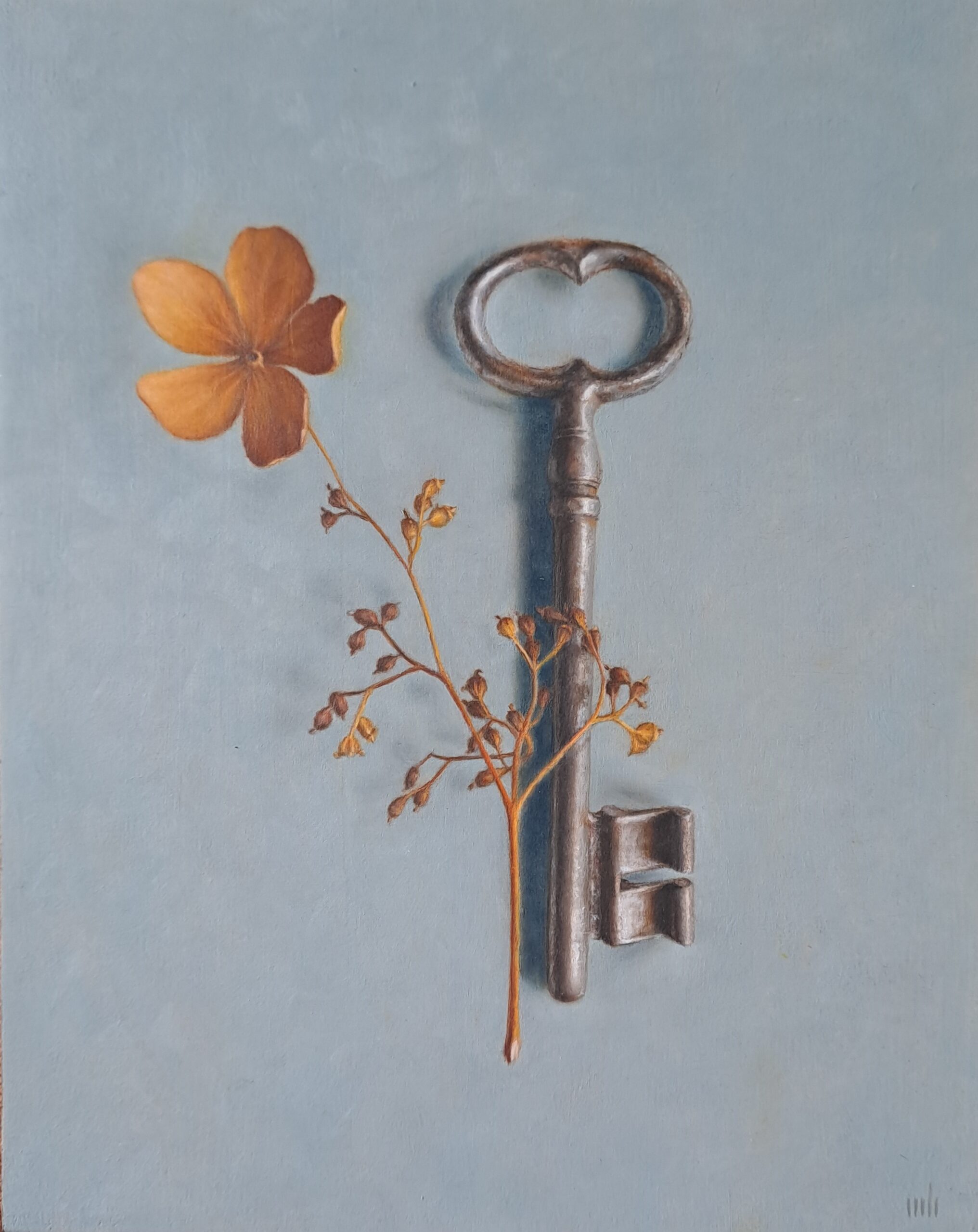 2. Maureen Huisman – Bekroond met de tweede prijs. Haar subtiele spel van verf en potlood brengt het thema vergankelijkheid tot leven: krachtig in eenvoud, teder in contrast.